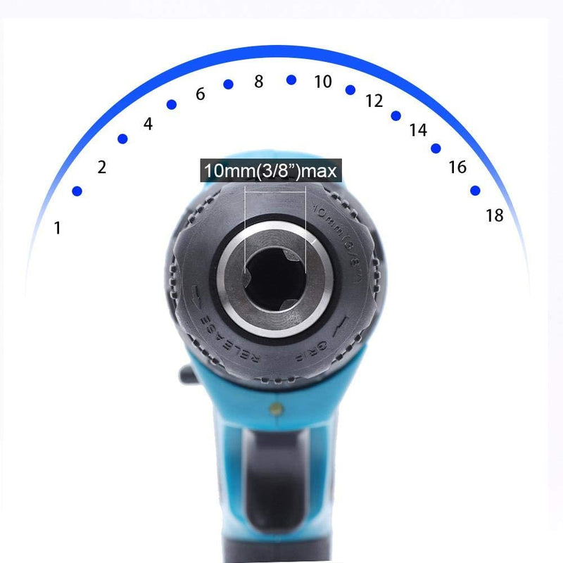 18+1 torque settings, 2-speed setting of 0-350/0-1300 r/min, and forward/reverse button, on/off switch.