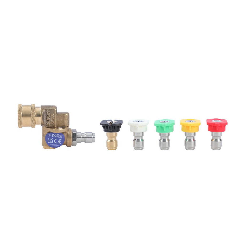 Connect pressure washer nozzle to pressure washer pivoting coupler and then connect the pivot coupler to wand or gun.