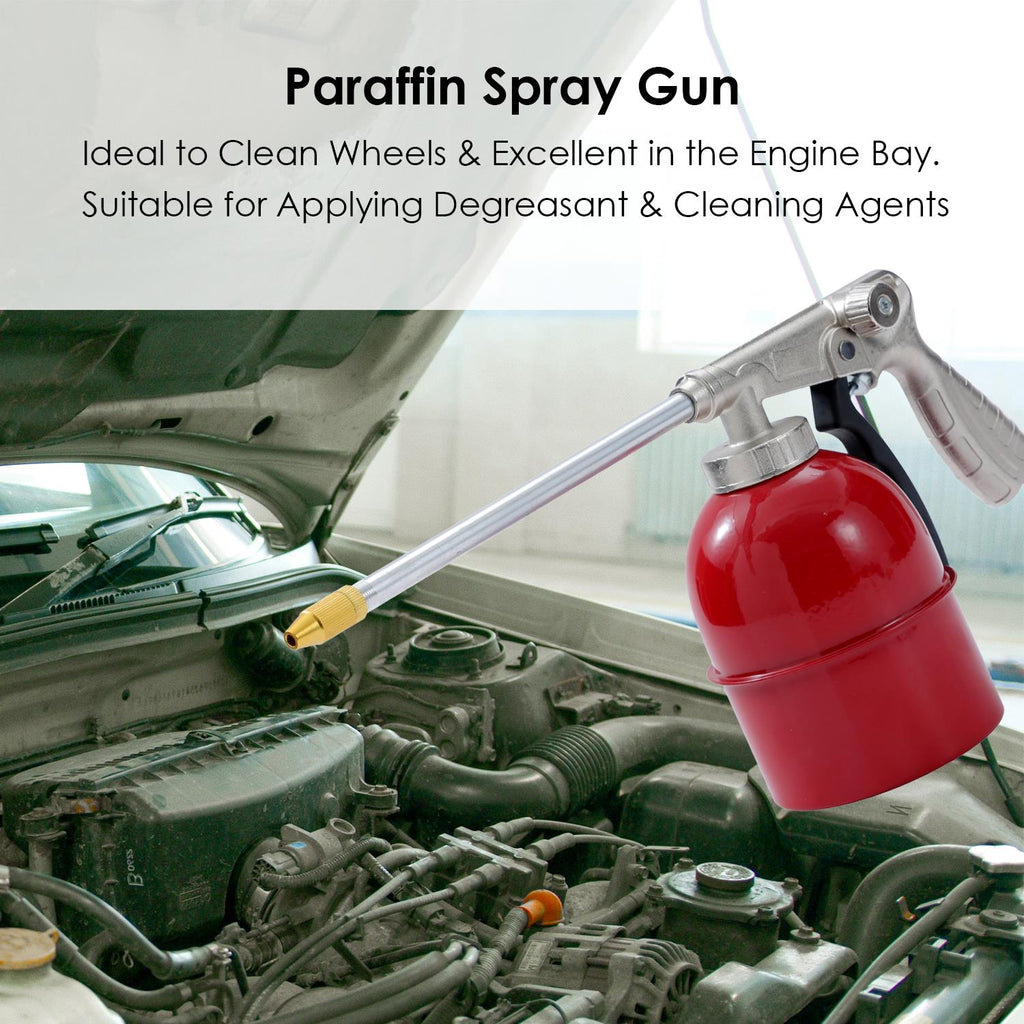 The Air Paraffin Gun produces a coarse spray for applying paraffin, de-greasers and similar cleaning products.