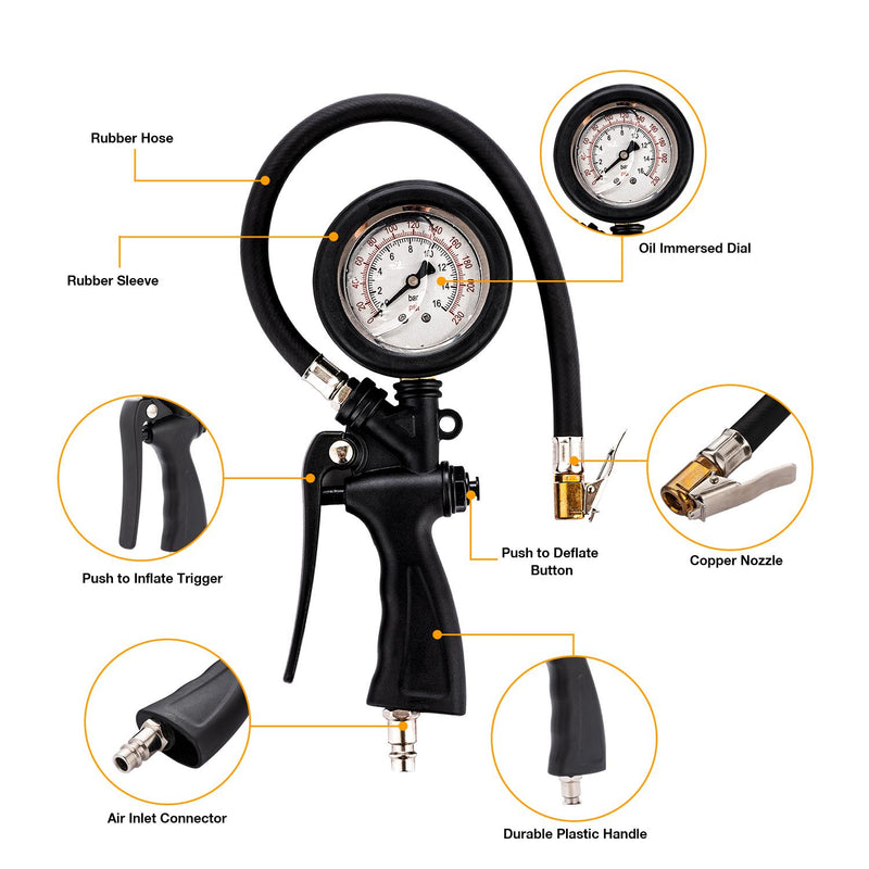 Air gauge for easy observation of pressure changes. Brass air chuck ensures long life span.