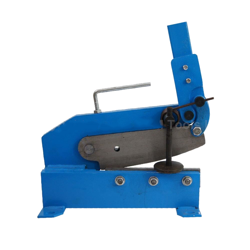 This shear bolts right to your bench or tabletop. It cuts flat mild, stainless steel, rod steel, non-ferrous metal, vinyl and plastic plate.