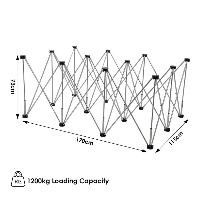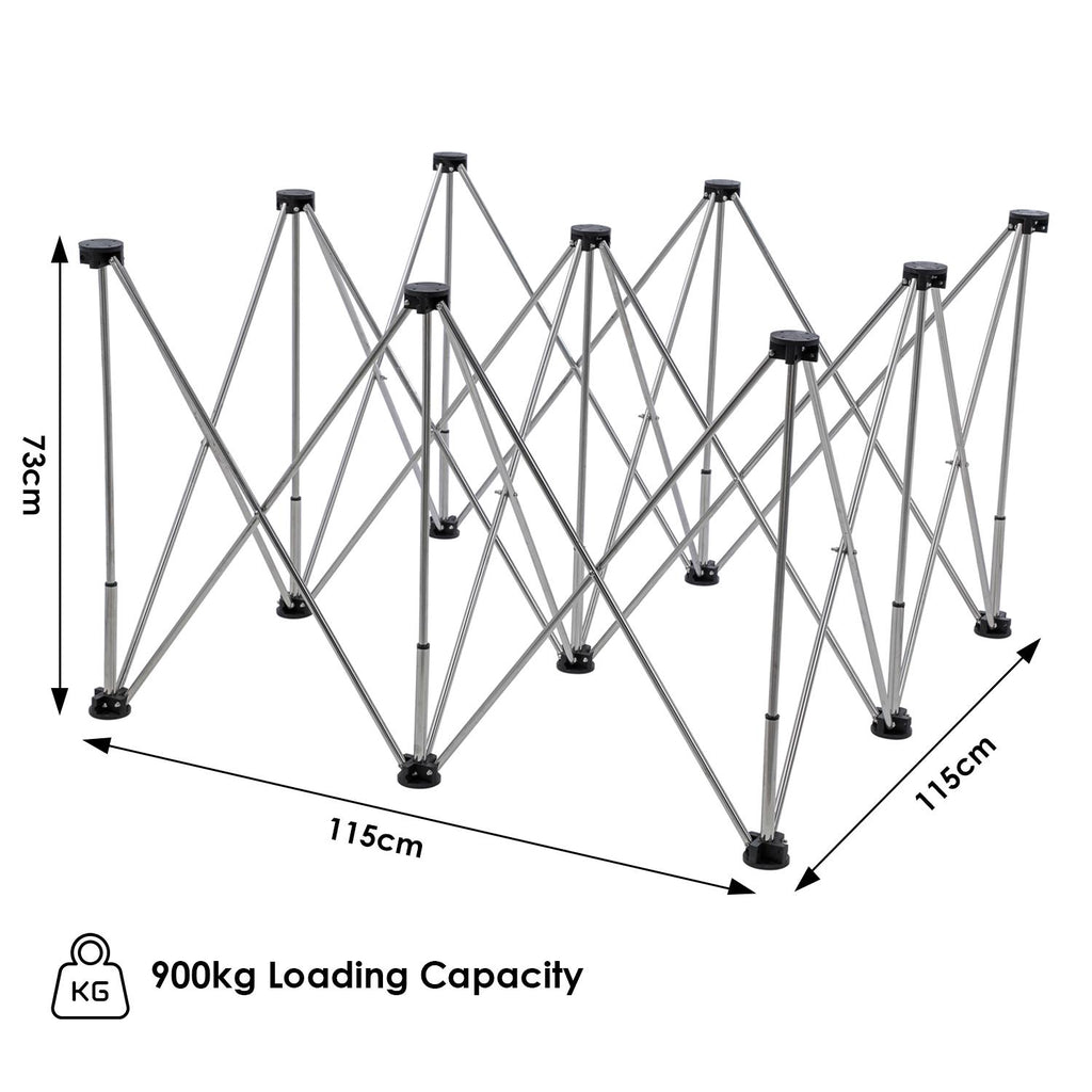 Stainless steel legs with multiple support points offer stable platform on ground surfaces.