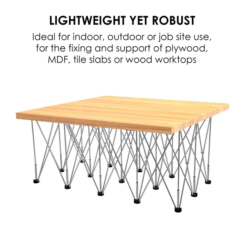 Ideal for indoor, outdoor or job site use, for the fixing and support of plywood, MDF, tile slabs or wood worktops.