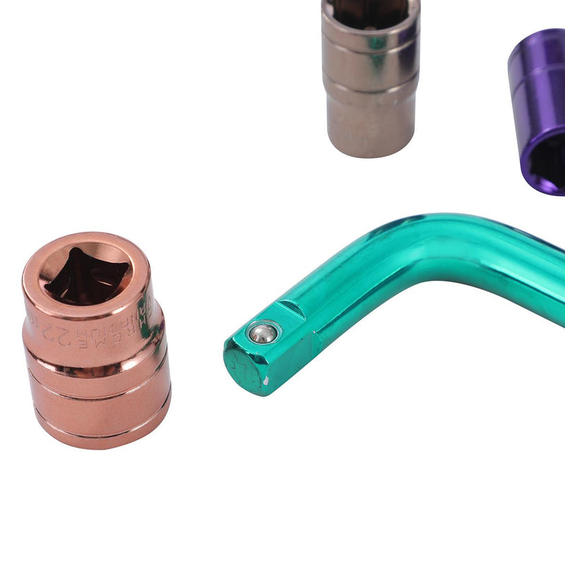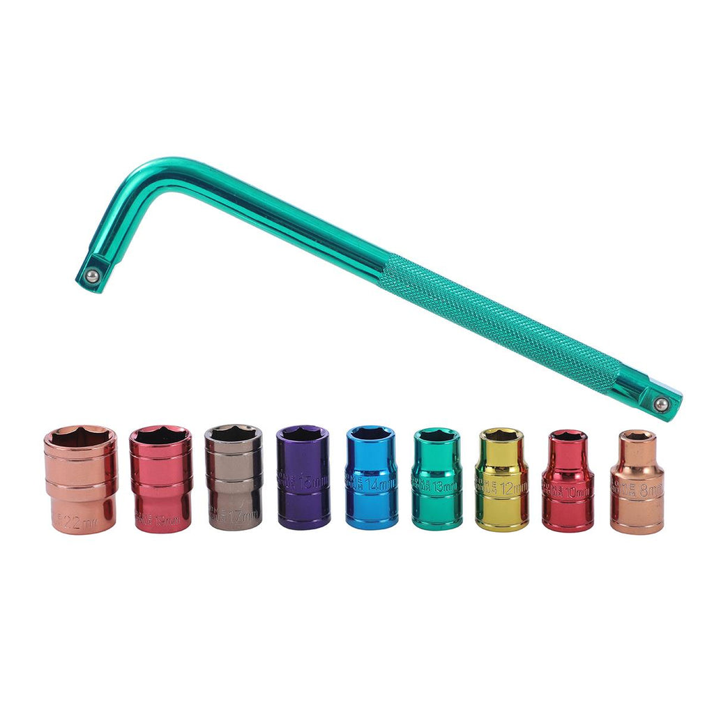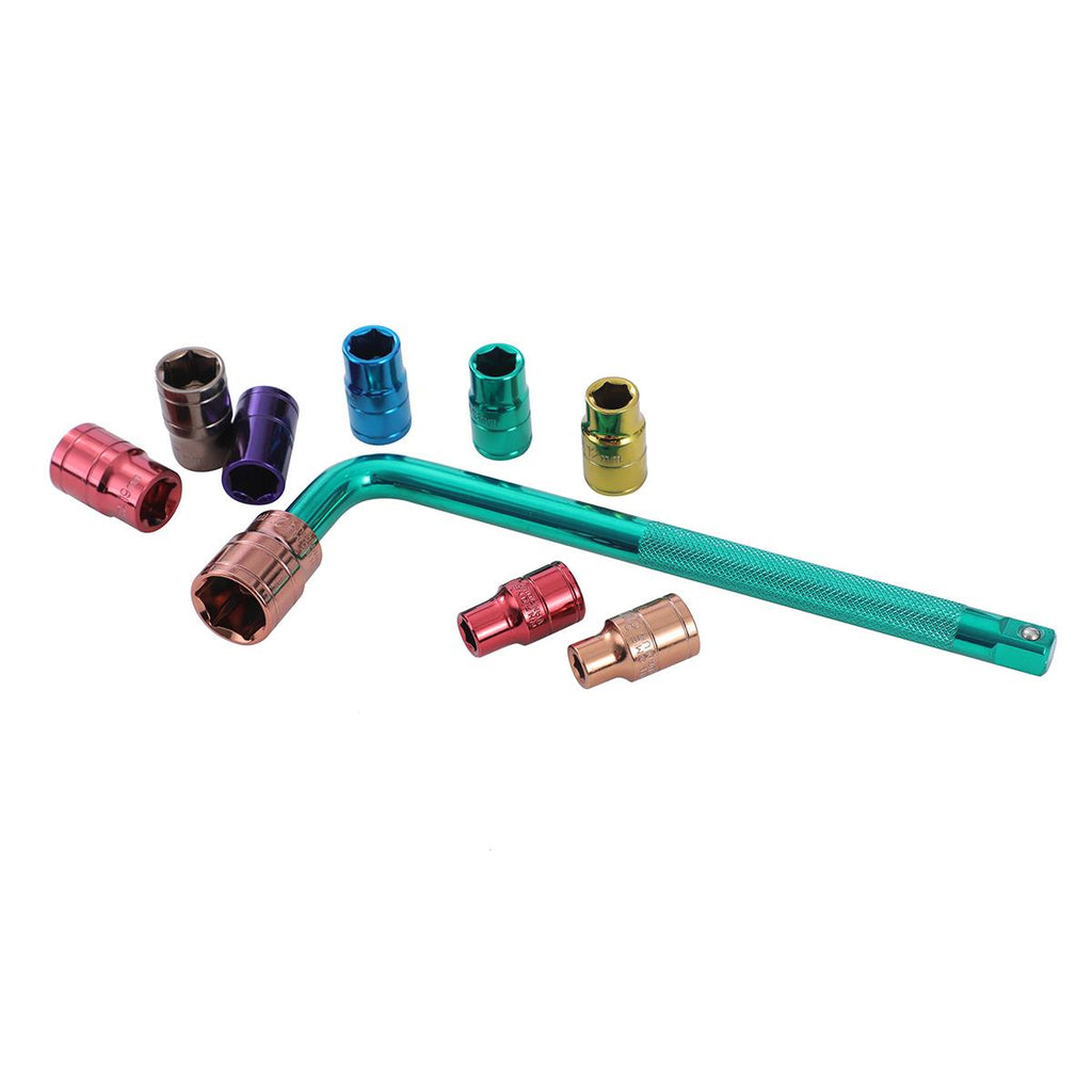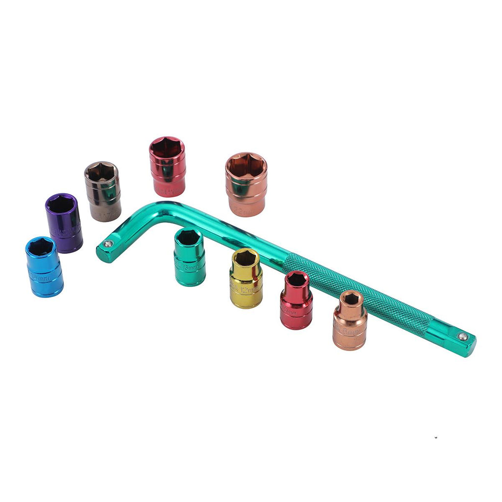 Set includes multicolour sockets : 8/10/12/13/14/15/17/19/22mm and 250mm L shanpe handle wrench.