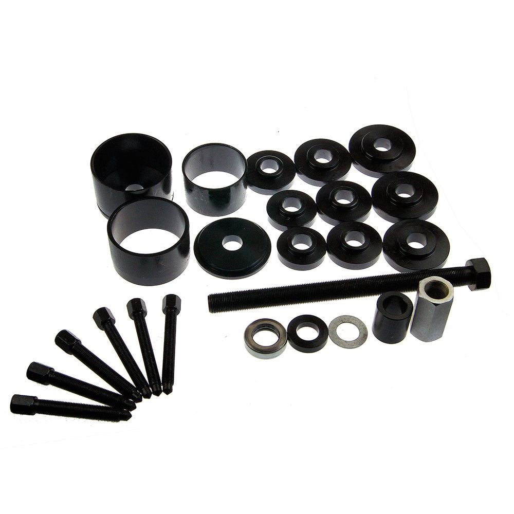 Spezialwerkzeug zur Demontage und Montage von Radlagern im eingebauten Zustand des Achsschenkels. - 1 x Abzieherspindel 300 mm- 1 x extra lange Druckmutter zur besseren Lastaufnahme (65 mm) - 1 x geschlossenes Drucklager schützt vor erhöhter Reibung beim Arbeitsvorgang. - 9 x Kugellager-Druckplatten55.5mm?59mm?62mm?65mm?66mm?71.5mm?73mm?78mm?84mm - 1 x Abziehglocke 76 mm - 1 x Abziehglocke 86 mm- 1 x Abziehglocke 91 mm - 3 x Schrauben M12 x 1.5 für Demontage Radnabe - 3 x Schrauben M14 x 1.5 für Demontage Radnabe - Suitable for most front wheel drive cars and vans