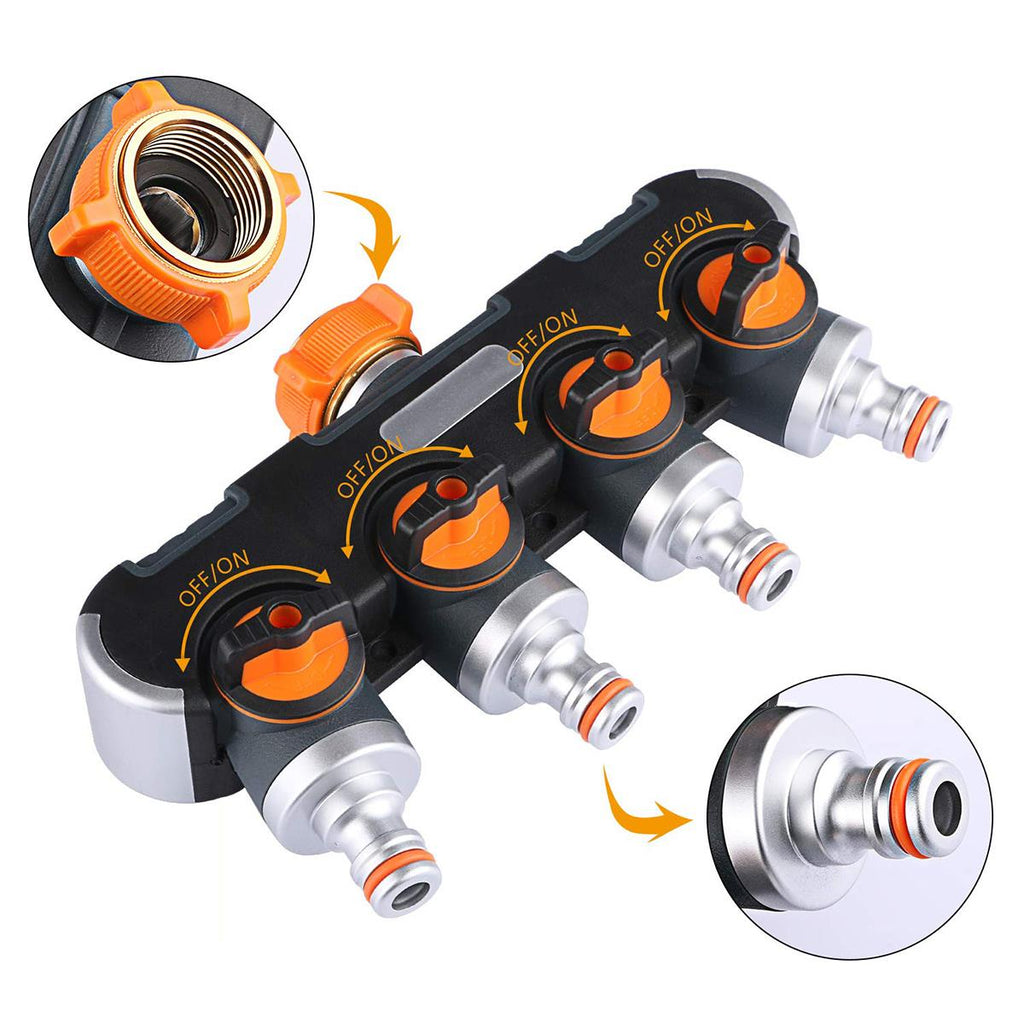 【4 Way Tap Splitter】Connect the device to garden tap or garden hose, suitable for 26.5mm (G 3/4") taps and 21mm (G 1/2") taps.