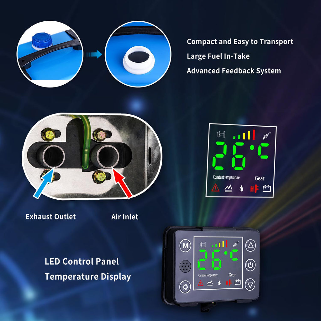 With the compact and portable design, it is an excellent choice for home, site office, shop and camping, also can be applied for heating the cab of various diesel mechanical vehicles such as caravans, cars, buses, RVs, trucks, engineering vehicles, etc.