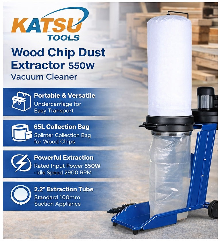 Maintain a safer, more efficient working environment with this KATSU Dust Extractor 550W 65L system. Designed to remove wood chips and airborne debris directly from your machinery, it helps reduce clean-up time and improve overall workshop control.